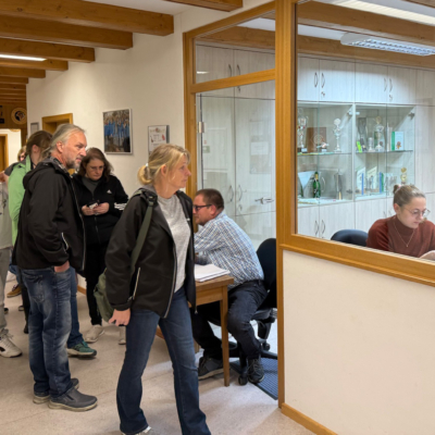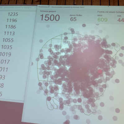 Etwas ruhiger, aber nicht weniger spannend, ging es beim Sauschießen am Luftdruckstand zu. Hier wird mit dem Luftgewehr auf ein virtuelles Schwein geschossen, das in einem Raster unterschiedliche Punktzahlen hinterlegt hat. Drei Schüsse ergeben eine Wertung, und das beste Ergebnis findet sich schließlich in der Highscore-Liste wieder. Auch hier spielte das Glück eine entscheidende Rolle, denn wer mehrere benachbarte Felder traf, durfte sich über eine hohe Punktzahl freuen. Insgesamt 105 Teilnehmerinnen und Teilnehmer versuchten ihr Glück – und wer mit seinem ersten Ergebnis nicht zufrieden war, konnte durch Nachkauf erneut antreten, um in der Rangliste noch weiter nach oben zu klettern. Die Platzierung entschied schließlich darüber, in welcher Reihenfolge man sich seinen Teil der „Sau“ abholen durfte.