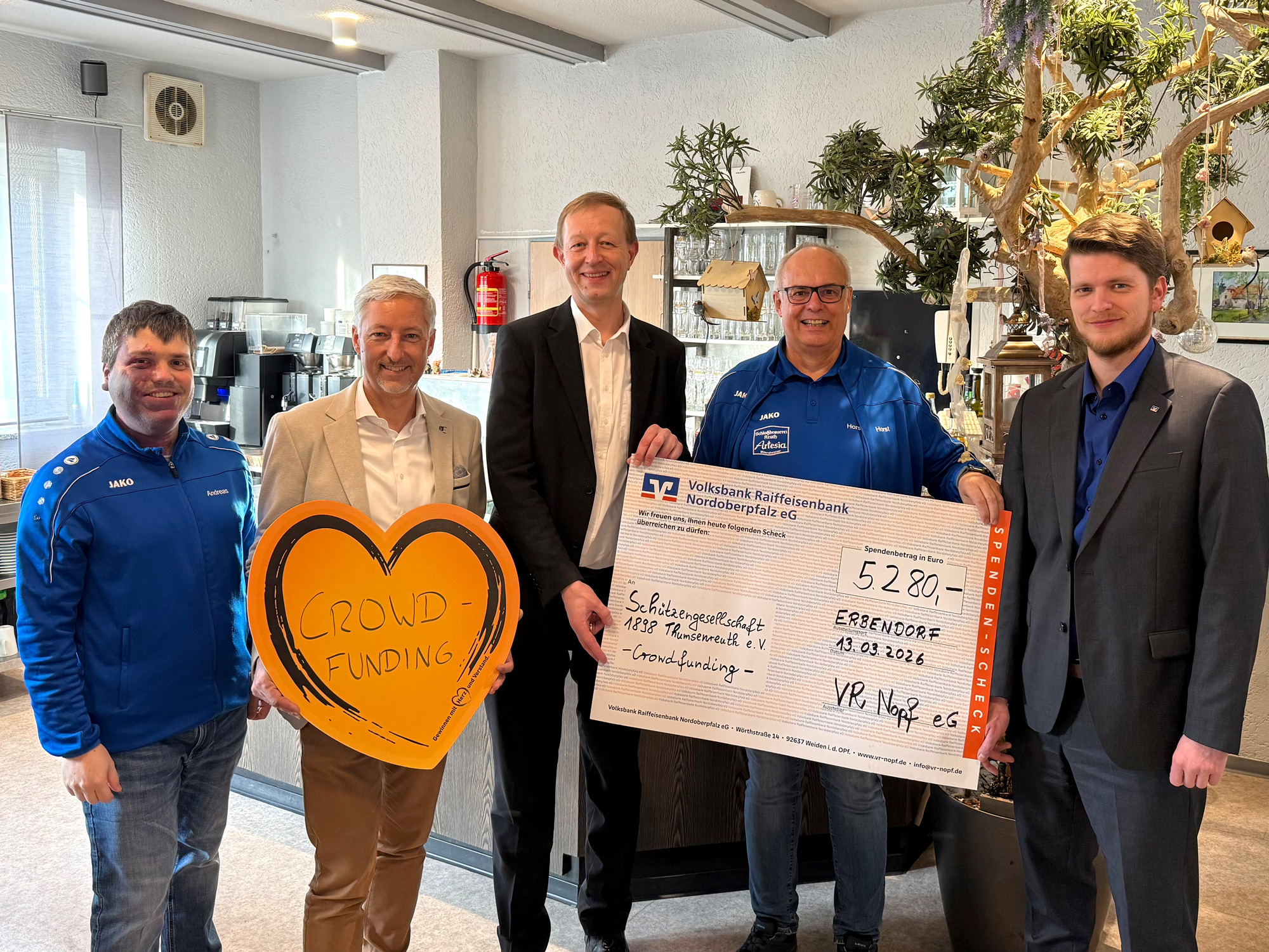 Bereits zum fünften Mal beteiligen sich die Thumsenreuther Schützen erfolgreich an einem Crowdfunding-Projekt der Bank. Unter dem Titel „Neue Theke – Energiesparen im Schützenverein“ soll insbesondere der Austausch des alten Kühlgeräts umgesetzt werden, das bislang einen hohen Stromverbrauch verursacht.